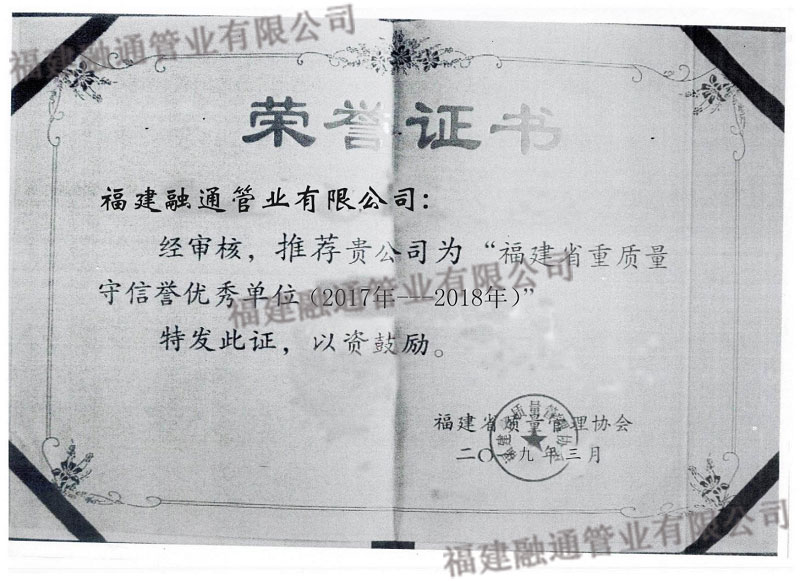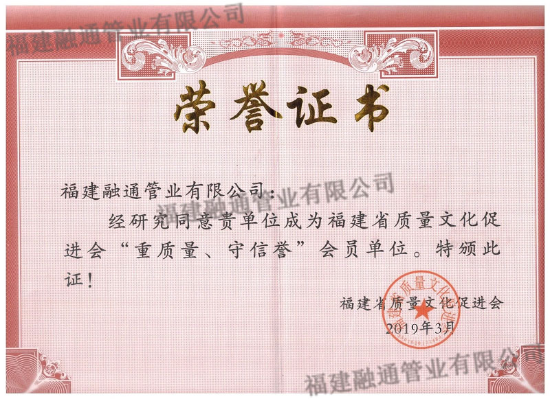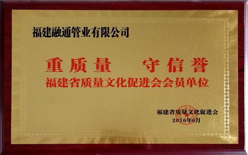 福建省質(zhì)量文化促進(jìn)會榮譽證書